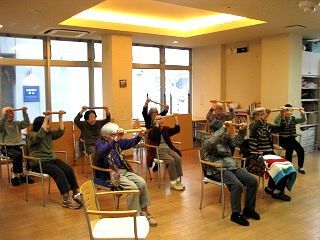体操やカラオケ、お菓子作りなどや様々なゲームを行い、身体機能の維持、回復を図る